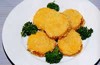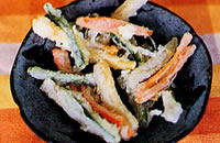 千切りにする。 A.衣をつくり、@の野菜につける。(衣に青のりを加えると色が引き立つ) B.170℃の油であげる。(揚げ油にごま油を少量加えるとからりと揚がる) |