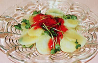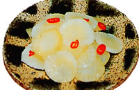 【作り方】 @.ヤーコンは厚めに皮をむき輪きりにして酢水に洗い、水気を切る A.酢に砂糖を溶かし、出しこぶをいれ、にんじん、赤唐辛子を入れる。 B @をAに入れ、しばらくおく ◎好みにより、唐辛子と酢の量を変えてください。 |