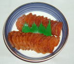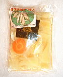 【作り方】 @.ヤーコンは皮をむき(酢)水に漬ける。 A.4%の塩で1週間下漬け後水気を切る。 B.酒粕、砂糖、塩、焼酎を混ぜ合わせ粕床を作る。 C.漬物容器にBをしき、下漬けヤーコンを並べこれを繰り返して漬け込む。 D.味がなじむまで、半年おく。 |