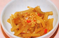【作り方】 @.ヤーコンは皮をむき、5〜6cmの長さの拍子木に切り、(酢)水にさらし、水気を切る。 A.鍋にごま油を入れヤーコンを炒める。 B.砂糖・醤油・酒を加え、唐辛子を入れて水気がなくなるまで炒める。 C.盛り付けて、煎りごまをふりかける。 |