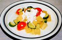 【作り方】 @.きゅうりは縦半分にし、1cm巾に切り、塩をふりかけ約15分おき、水気を切る。 A.ヤーコンは皮をむき、きゅうりと同様の大きさに切り、約10分茹でて水気を切る。 B.プチトマトは半分に切る。 C.@、A、Bの材料を器に盛り、ヨーグルトをかける |